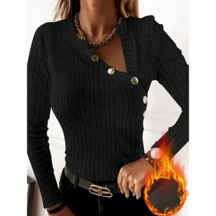 – Luxurious textured fabric– Elegant V-neck neckline Specifications Fabric:Polyester,TexturedTops Type:ShirtGender:Women’sDesign:Buttons,PatchworkOccasion:DailyStyle:Basic,CasualCategory:T-shirtFit Type:Regular FitNeckline:V NeckSleeve Length:Long SleeveElasticity:StretchyLook After Me:Hand wash,Machine washTop Length:Regular