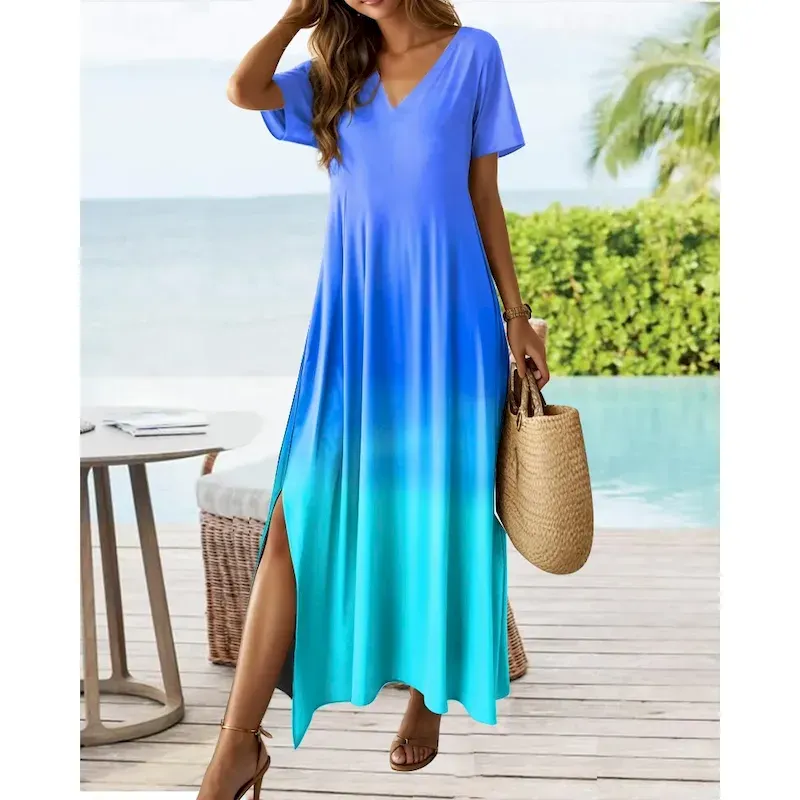 Women’s Maxi Dress Casual Dress Sundress Shift Dress Tropical Drop Shoulder Vacation Loose Fit Ombre Rainbow Color Gradient Short Sleeve V Neck Blue L