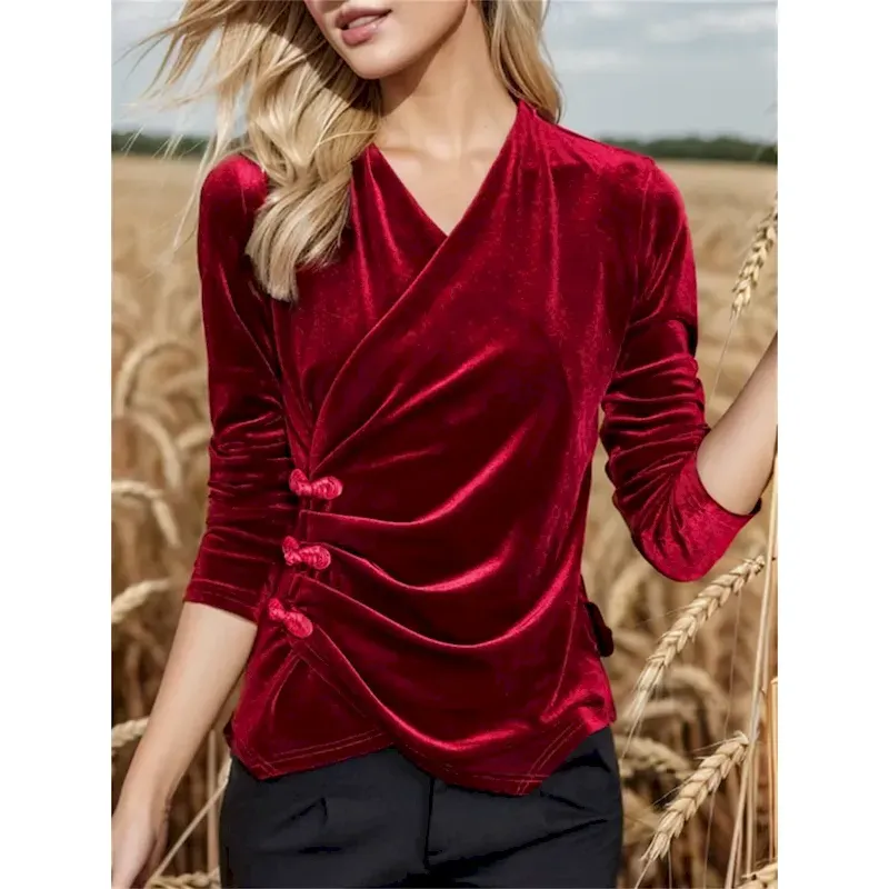 Women’s Shirt Blouse Plain Fashion Long Sleeve V Neck Regular Tops Casual Flowing tunic Black Wine Fall & Winter 2025