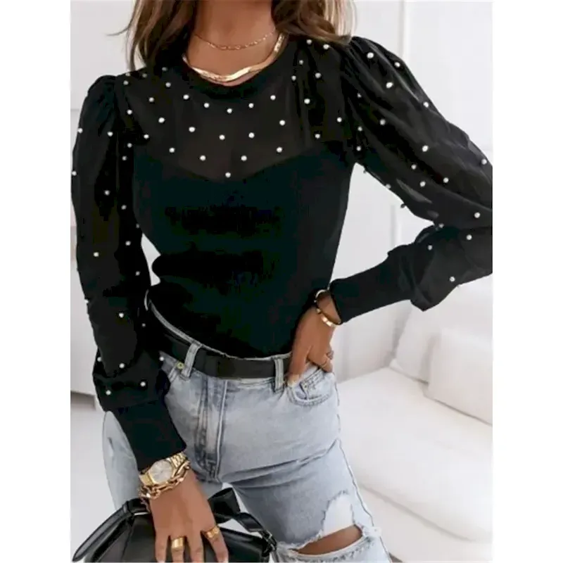 Womens-Shirt-Blouse-Polka-Dot-Casual-Long-Sleeve-Crew-Neck-Regular-Tops-Daily-Mesh-Patchwork-Black-Fall-Winter-2025