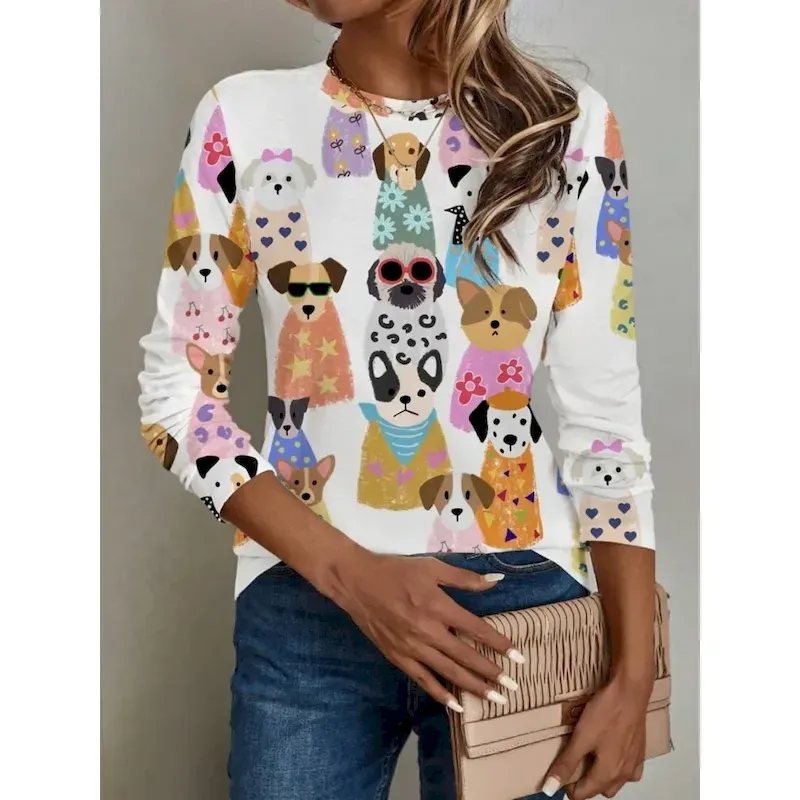 Womens-T-shirt-Crew-Neck-Long-Sleeve-Tunic-Cat-Dog-Casual--Regular-Tops-Daily-Print-White-Spring-Fall-2025