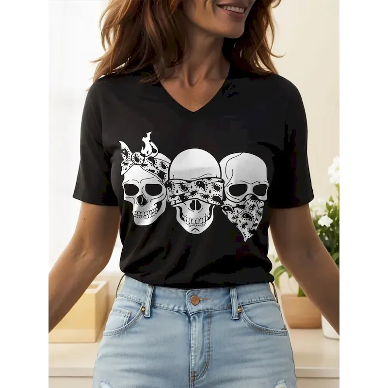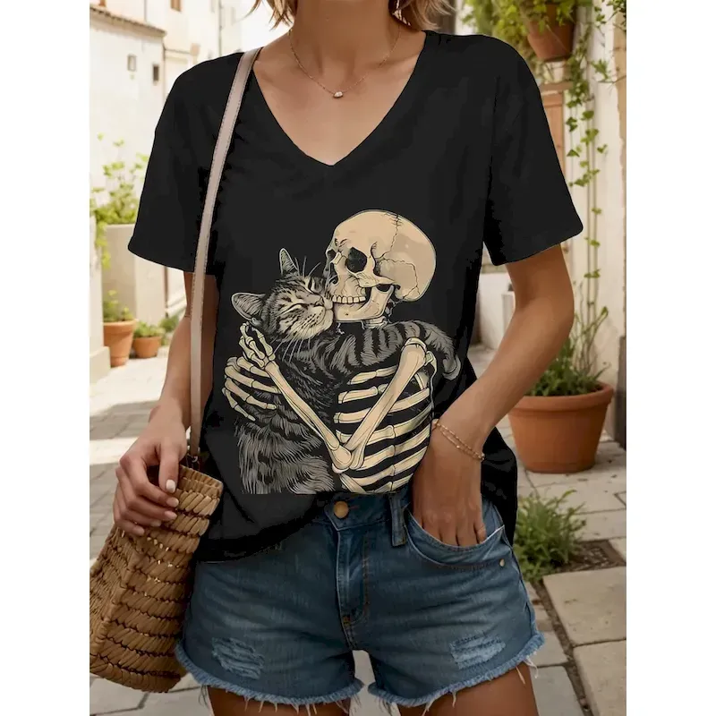 Womens-T-Shirt-Skulls-Graphic-Cat-Vintage-Stylish-Classic-Short-Sleeve-V-Neck-Regular-Tops-Daily-Print-Black-and-White-Black-White-Yellow-Pink-Summer
